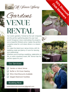 Mt. Vernon Winery’s Gardens and Island make the perfect venue for your Dream Event!